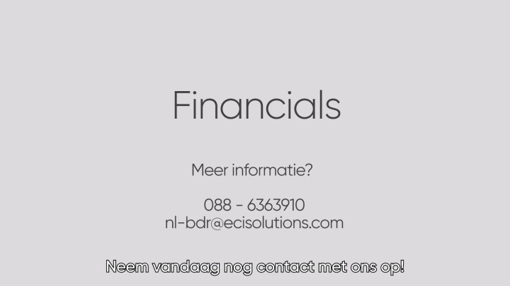 Financials is een zeer gebruiksvriendelijk boekhoudprogramma, speciaal voor bedrijven in de maakindustrie en bouw- en installatiebranche en volledig geïntegreerd in ECI ERP-software. Hierdoor worden onder meer volledig automatisch inkoop- en verkoopfacturen geboekt en debiteuren-, crediteuren- en betalingsgegevens uitgewisseld.